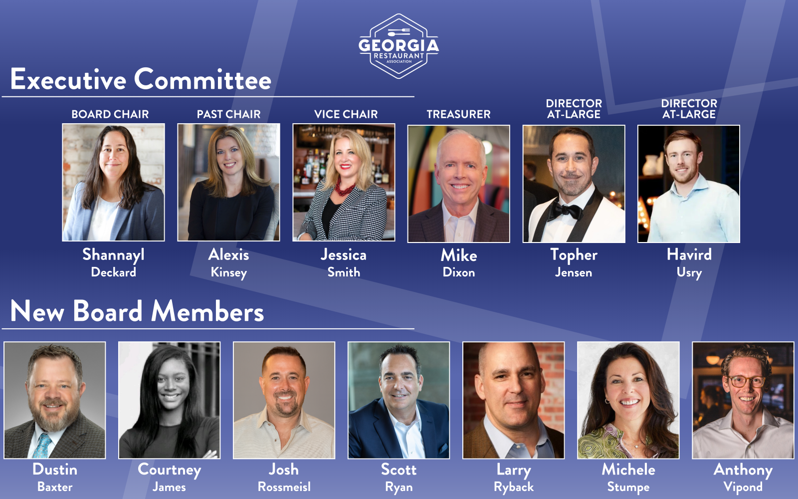 ATLANTA (Jan. 29, 2026) – The Georgia Restaurant Association (GRA) is pleased to announce the organization’s Board of Directors for 2026. The executive committee includes Board Chair Shannayl Deckard, vice president of human resources, restaurants for Legacy Ventures; Past Chair Alexis Kinsey, co-founder for Fork U Concepts; Vice Chair Jessica Smith, vice president of marketing for Ted’s Montana Grill; Treasurer Mike Dixon, chief financial officer for GoTo Foods; and at-large members Topher Jensen, director of commercial sales at Gas South, and Havird Usry, vice president of operations and development for Fat Man’s Hospitality.